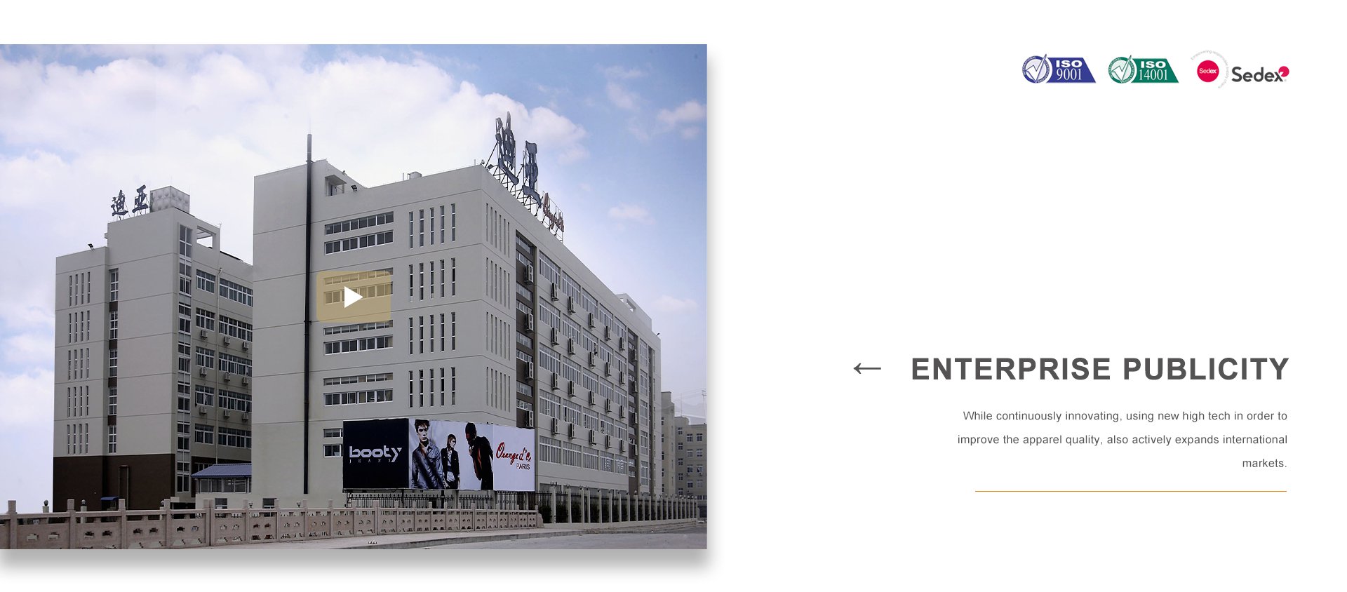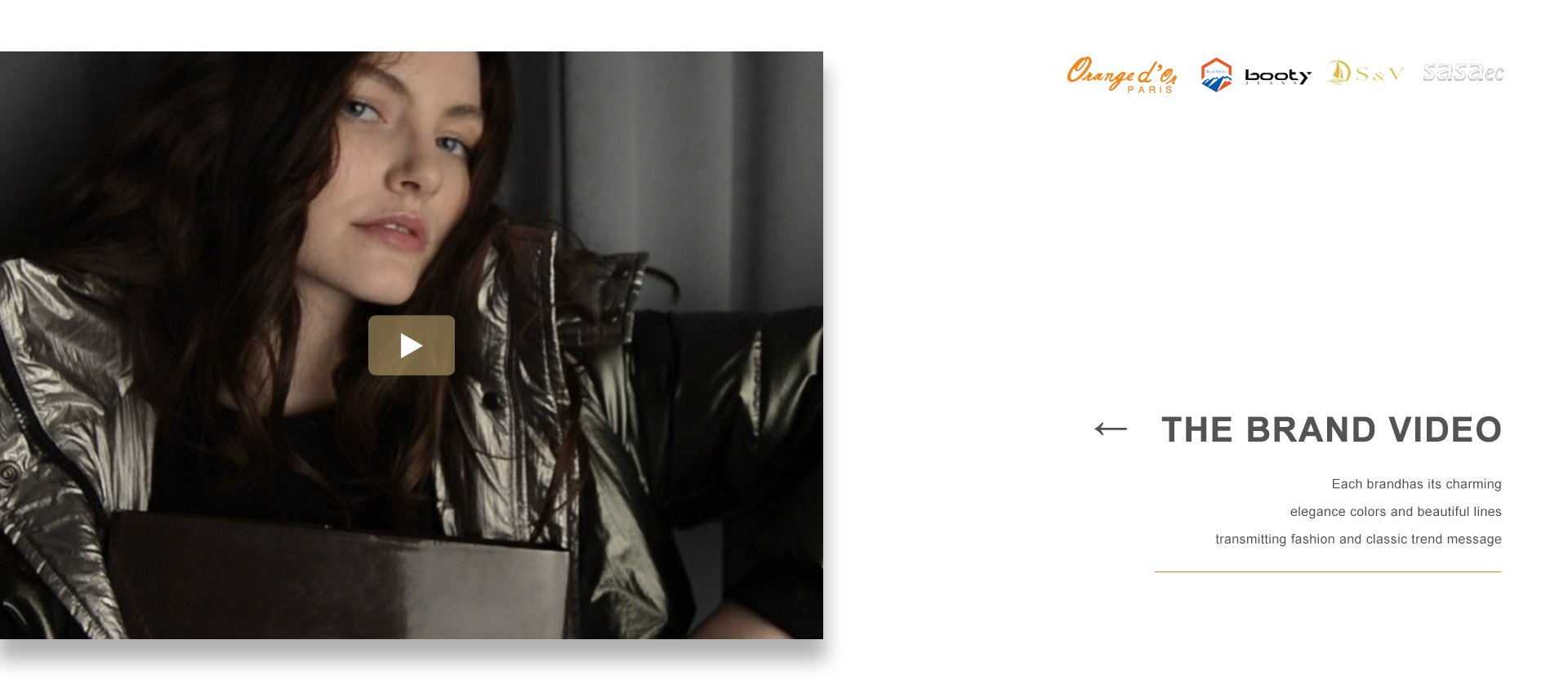 浙江迪亞服飾有限公司于1998年在世界時(shí)尚品牌之都——法國巴黎二區(qū)應(yīng)運(yùn)而生。同年,在浙江省甌海經(jīng)濟(jì)開發(fā)區(qū)東方南路28號設(shè)立服裝制造工廠。公司集服裝設(shè)計(jì)、生產(chǎn)、營銷、品牌于一體,在不斷創(chuàng)新、采用高新技術(shù)提高服飾質(zhì)量的同時(shí),積極拓展國際市場,海外營銷部長期與LV集團(tuán)旗下的MAJE、SOEUR、BALIBARIS等國際著名品牌保持非常緊密的合作關(guān)系。品牌建設(shè)是公司堅(jiān)持不懈的追求,我們每年都會積極參加國內(nèi)外舉辦的各大服裝展銷會。憑借著良好的質(zhì)量與信譽(yù),市場占有率在逐漸擴(kuò)大,產(chǎn)品遠(yuǎn)銷歐洲、美洲、亞洲等國。公司以生產(chǎn)棉衣、羽絨服、派克、大衣、夾克、運(yùn)動休閑服飾等為主,旗下主打品牌有 ORANGE D’OR 、CLAIRVAL、BOOTY JEANS 、S&V和SASAEC,各品牌服飾均以典雅的色彩、優(yōu)美的線條、卓越的魅力吸引著都市麗人,將時(shí)尚、經(jīng)典的潮流信息予以淋漓盡致的演繹。